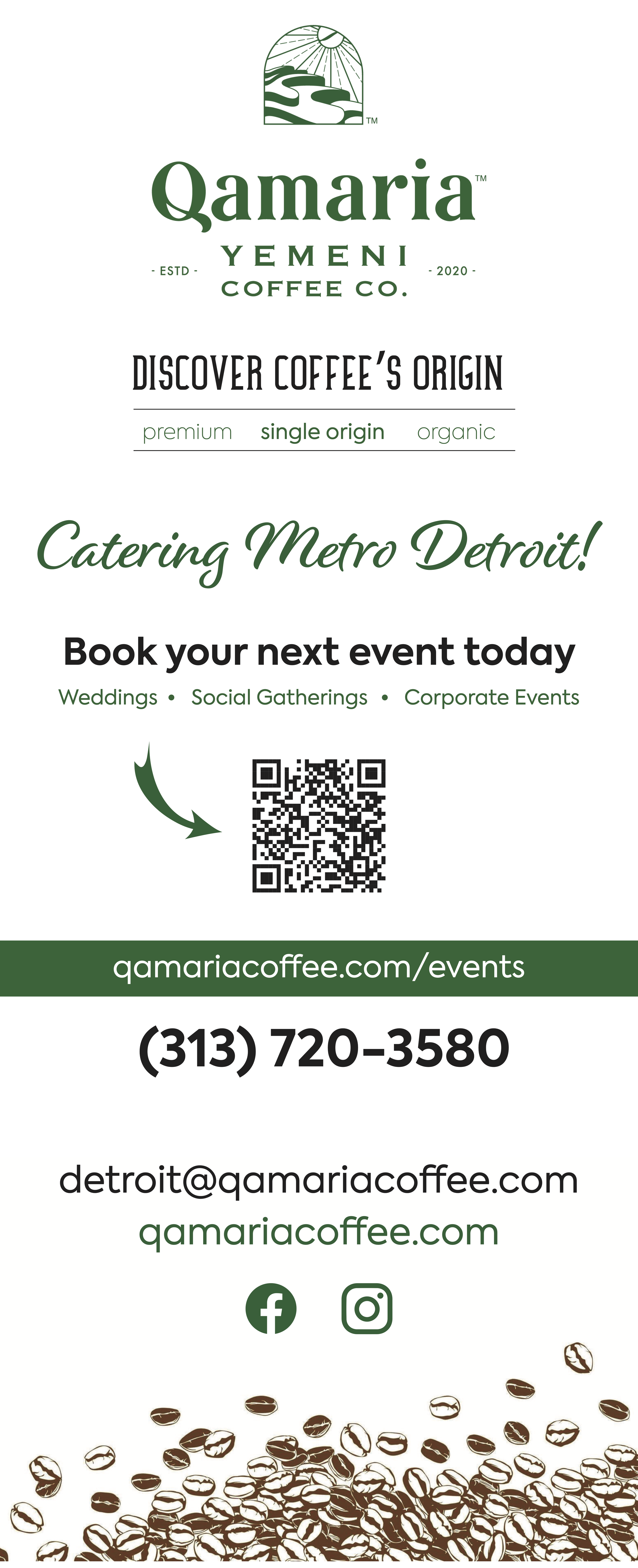 Client requested a retractable banner highlighting their new catering services and menu. Font style and colors were selected based off Qamaria’s brand.